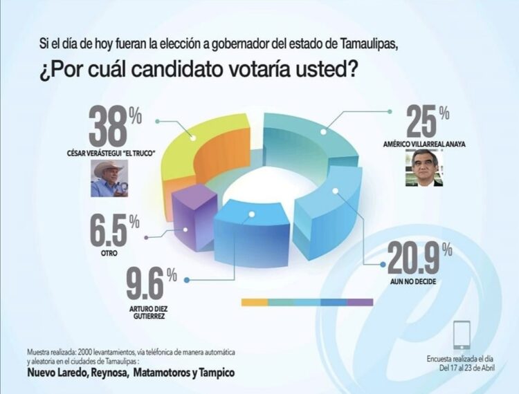 Nueva encuesta realizada entre el 17 y 21 de abril posiciona a César ”Truko” Verástegui como el preferido de los tamaulipecos para ser el próximo gobernador del estado.