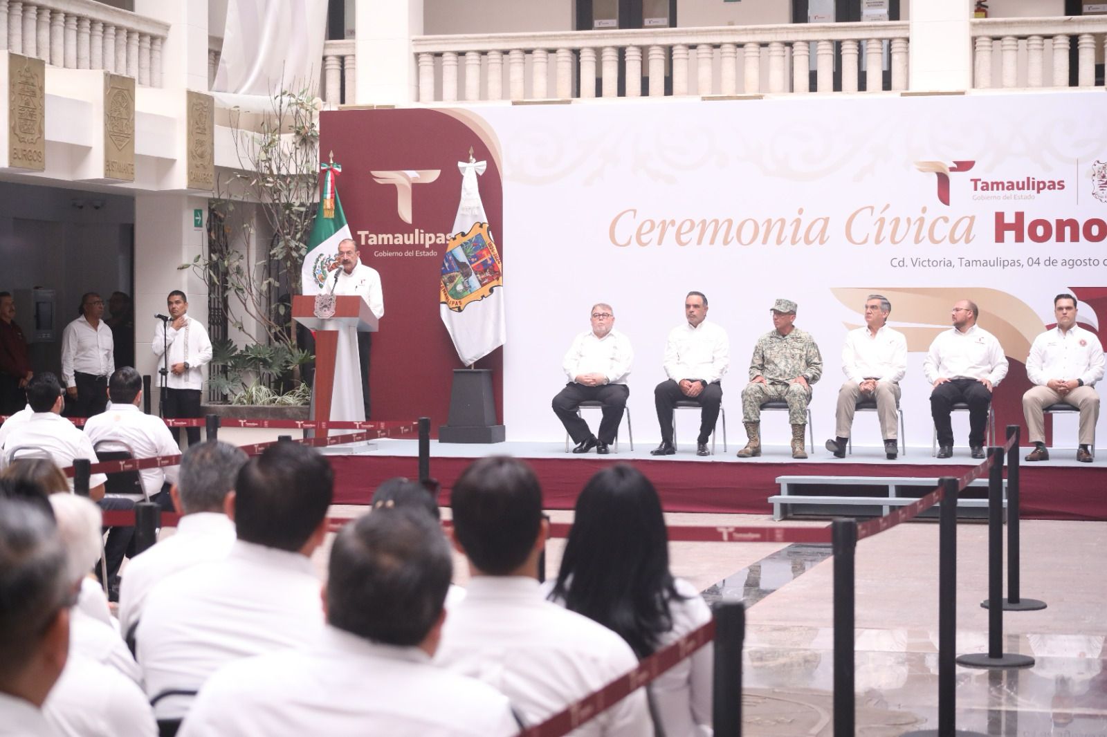 Al dar la bienvenida a la ceremonia cívica, Héctor Joel Villegas González, secretario General de Gobierno, hizo un llamado a las y los servidores públicos para seguir el ejemplo del gobernador Américo Villarreal y demostrar que “servir a Tamaulipas no es una tarea de escritorio, sino una causa que se lleva con orgullo, entrega y honestidad”.