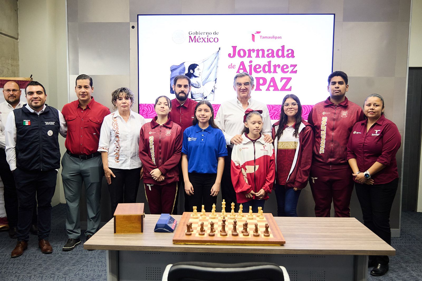 Como parte de la Jornada de Ajedrez por la Paz, y ante la presencia de las y los integrantes de la Mesa de Coordinación para la Construcción de Paz, el gobernador sostuvo una partida con Daniela Ordoñez Alarcón, de Altamira, quien recientemente logró coronarse campeona nacional de ajedrez en Querétaro, y representará a México en el Campeonato Panamericano, a celebrarse en Canadá.