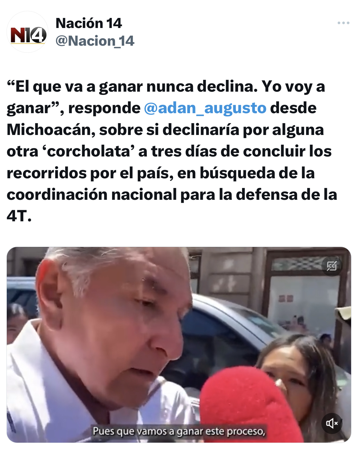 El ex secretario de Gobernación, Adán Augusto López, desde la plaza Melchor Ocampo de la capital michoacana, afirmó que no declinará por ningún de sus adversarios de partido y le tienen sin cuidado las encuestas porque “éstas las ganan quienes las pagan”.