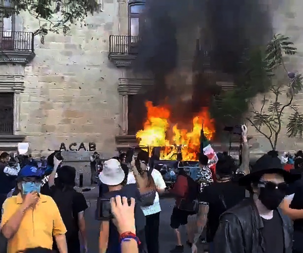 Luego de empujones los manifestantes lograron derrumbar la puerta principal del Palacio de Gobierno y ondeando la bandera del estado, exigieron la renuncia del gobernador, Enrique Alfaro.
