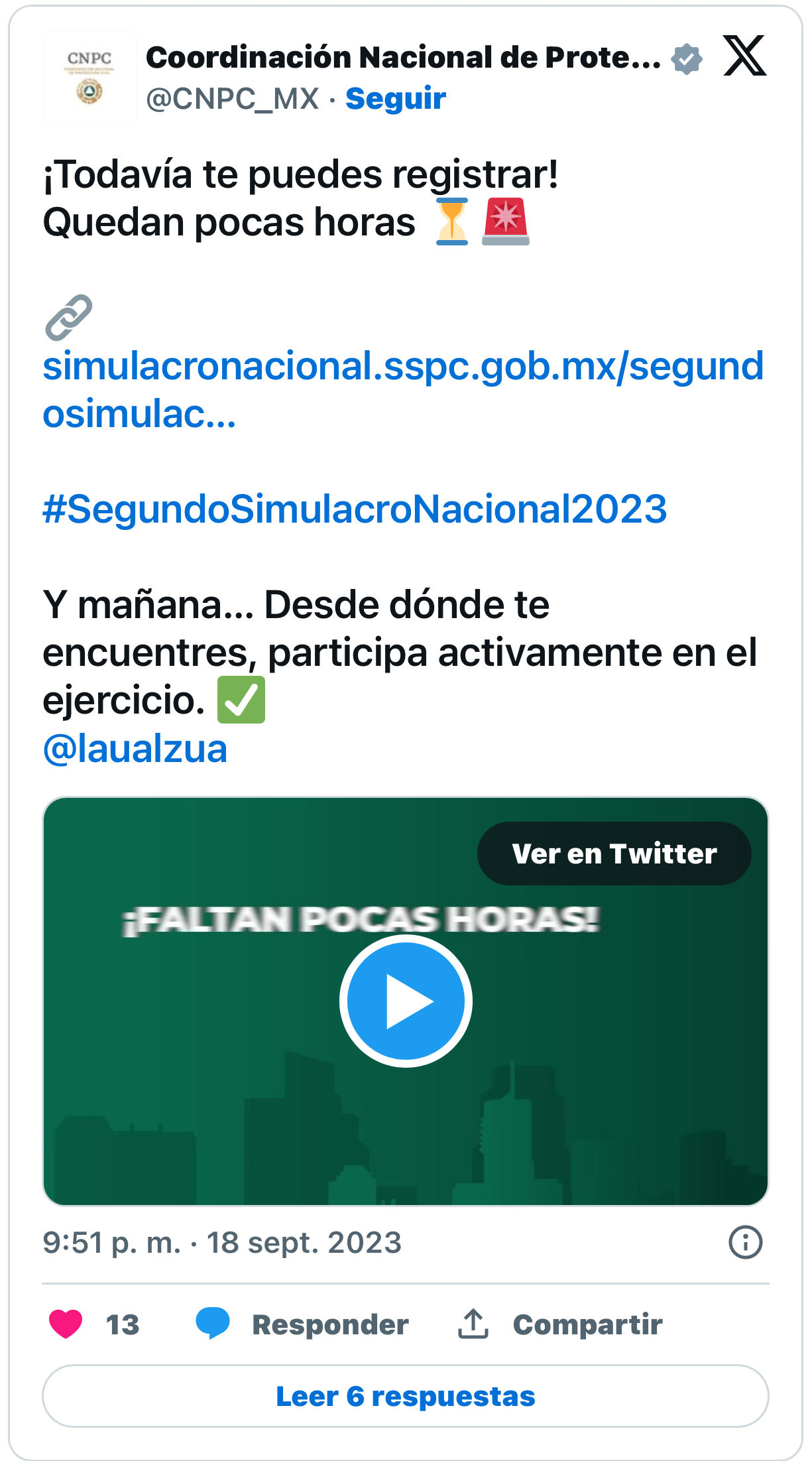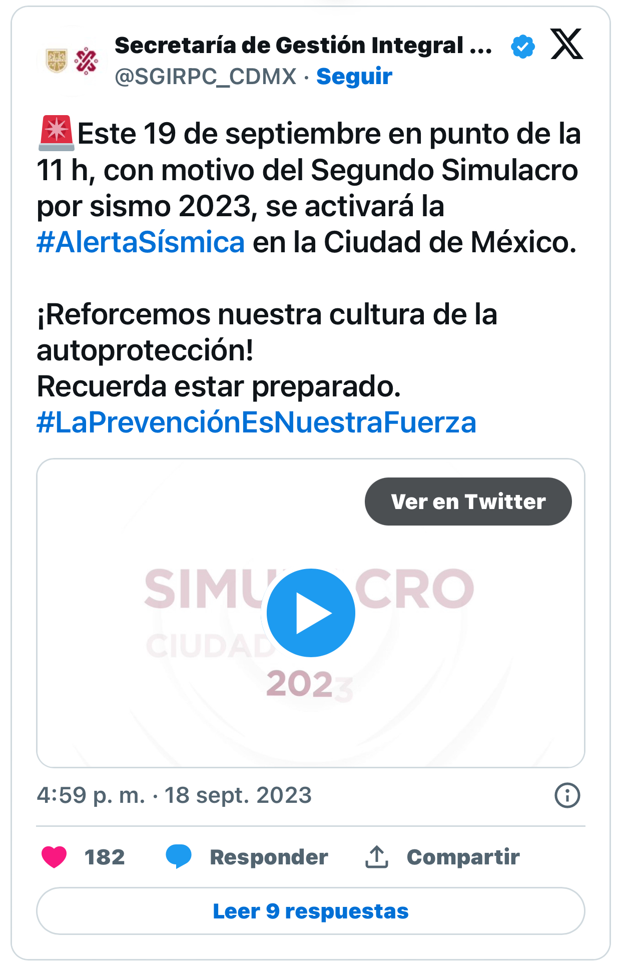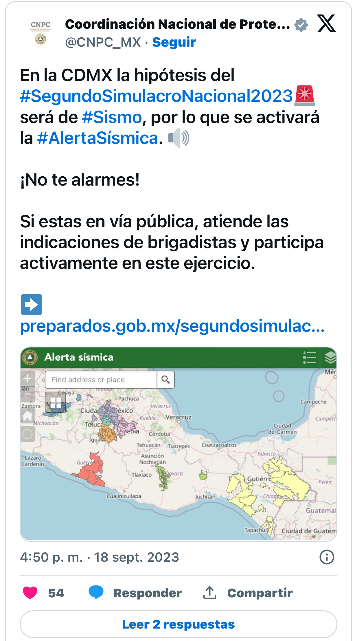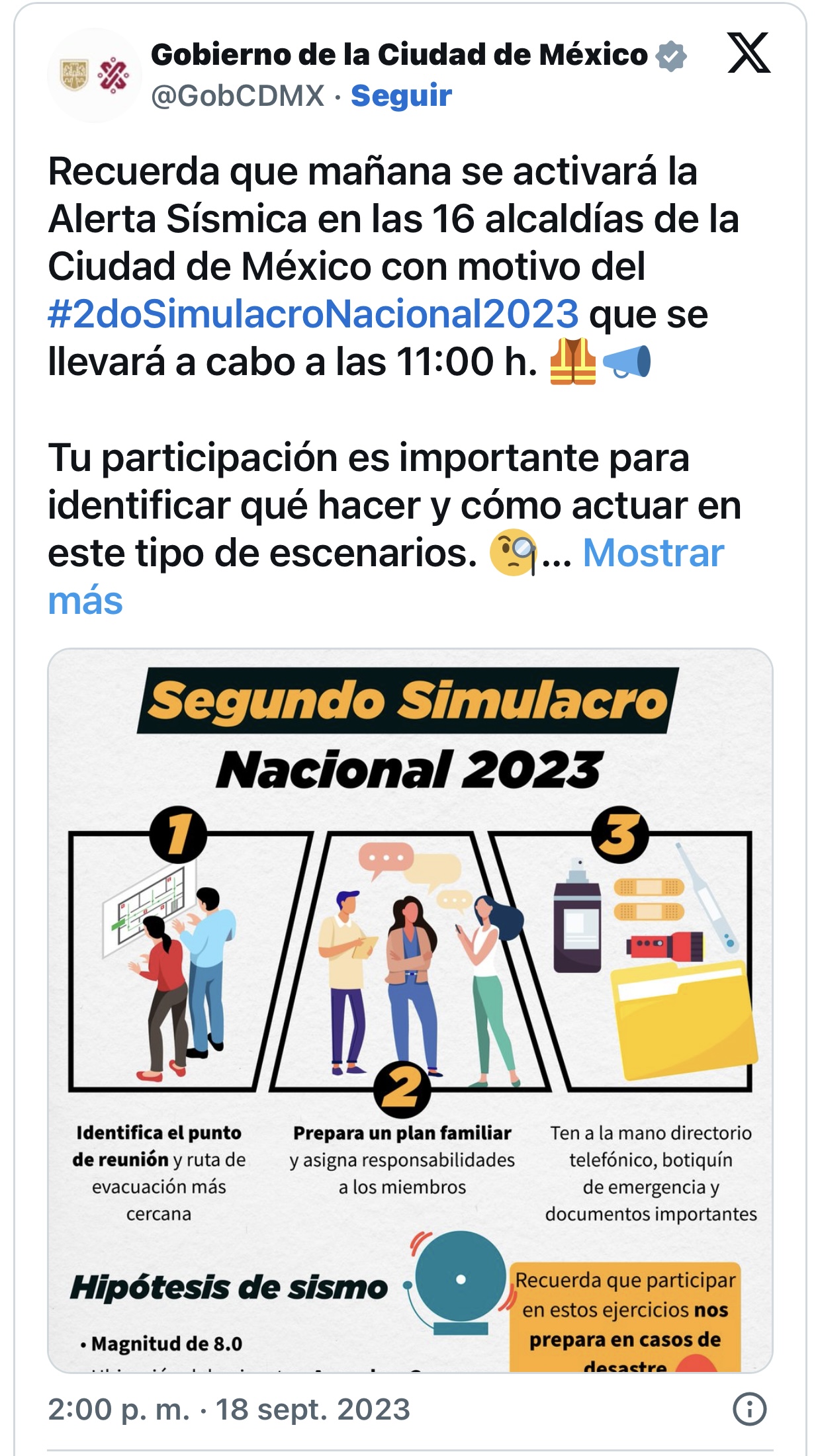 Este martes 19 de septiembre se realizará el Segundo Simulacro Nacional 2023 en punto de las 11:00 h tiempo del centro de México, en el que se plantearán cuatro hipótesis y escenarios por fenómenos que impactarían en distintas regiones del territorio nacional.