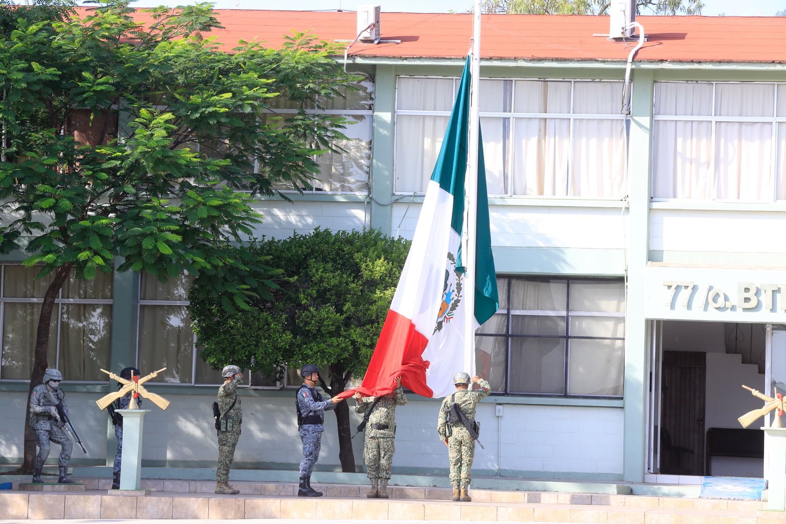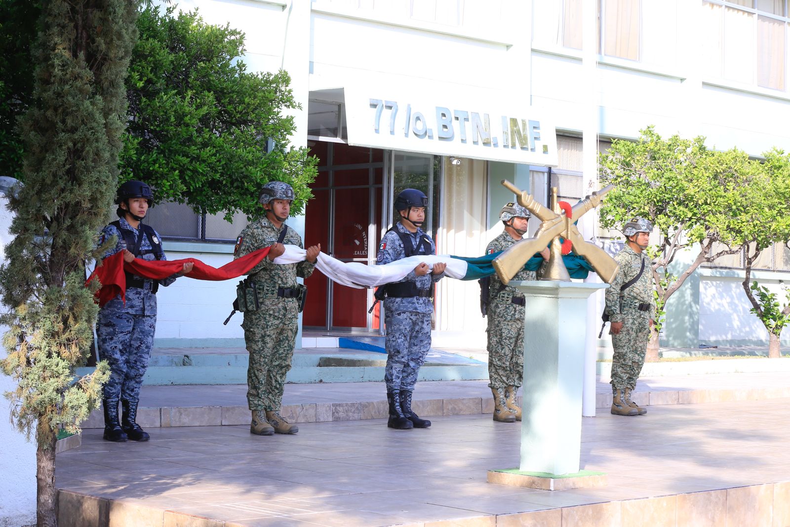 Al presidir la ceremonia de honores, este lunes, en el 77 Batallón de Infantería, el gobernador agradeció al general Enrique García Jaramillo, comandante de la 48 Zona Militar, por la suma cotidiana de mandos y tropas para que Tamaulipas sea uno de los estados que más avanza en seguridad.