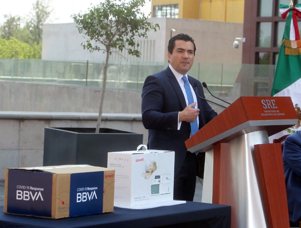 El secretario de Relaciones Exteriores, Marcelo Ebrard presentó la donación de mil ventiladores de soporte respiratorio por parte de BBVA México, mismos que llegaron en semanas recientes.