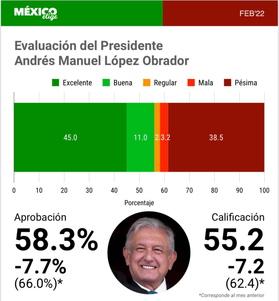 Según la casa de estudios “México Elige” que realizó el estudio vía redes sociales (Facebook), a más de 10 mil 500 ciudadanos mexicanos mayores de 18 años y con un margen de error de +-4%, López Obrador pasó de 66.0% en enero de 2022 a 58.3% para febrero del mismo año en la aprobación; y de 62.4% en enero de 2022 a 55.2% para febrero de 2022 en su calificación como presidente de la República.