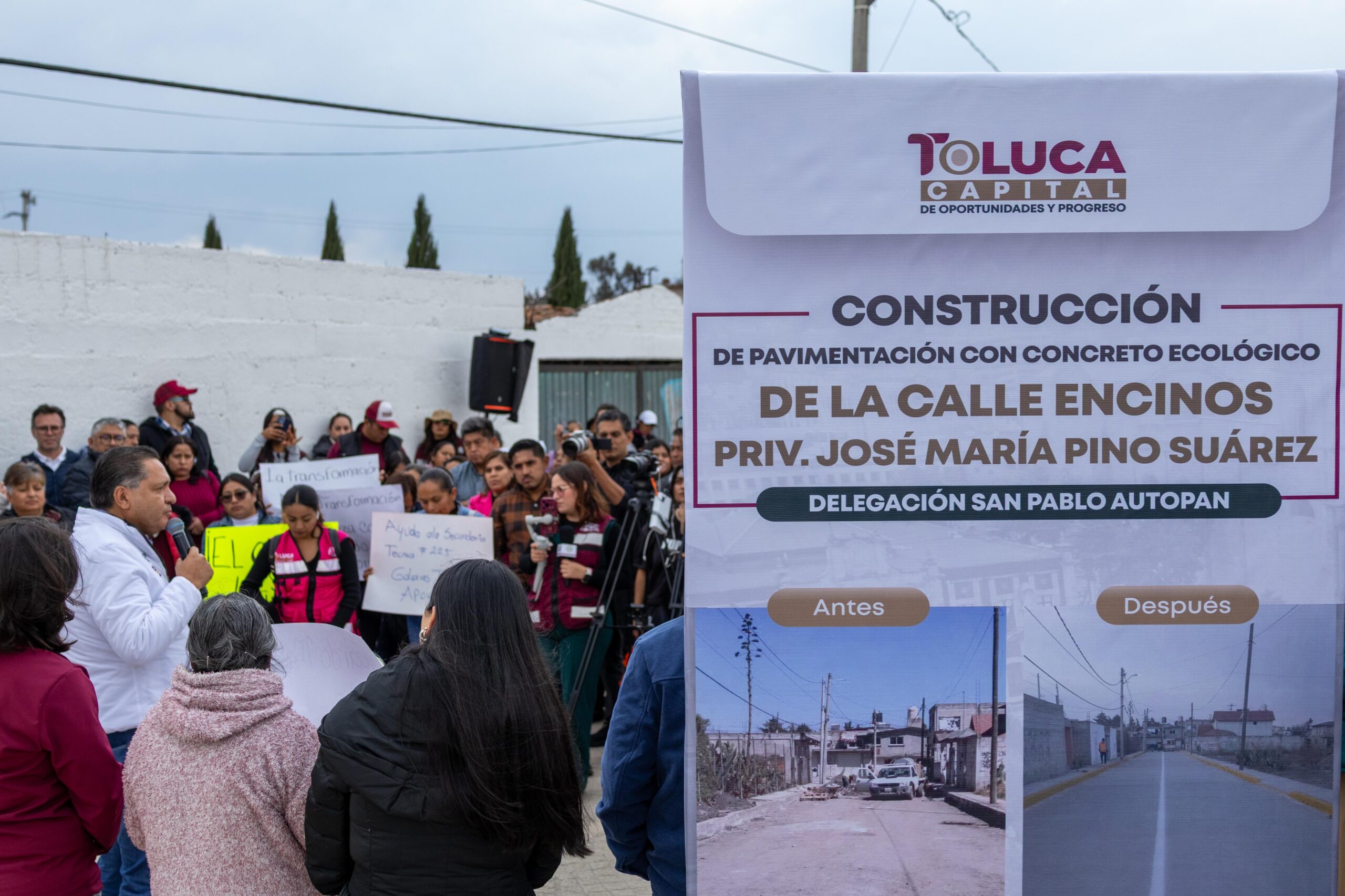 Entrega la calle Encinos, con pavimentación de concreto ecológico. Los habitantes de San Pablo Autopan son los primeros en utilizar esta nueva tecnología.