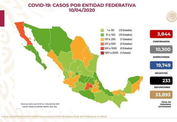 Ciudad de México, 10 de abril de 2020 (NACIÓN 14).- El director general de Epidemiología, José Luis Alomía informó que hasta el momento existen en México tres mil 844 casos confirmados de COVID-19, es decir, un aumento de 403 casos en las últimas 24 horas, 233 defunciones en total y se estudian 10 mil 300 sospechosos.