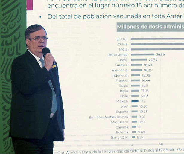 “¿Dónde estamos a nivel internacional?… Con la estrategia que ha encabezado el presidente de la República, México en números absolutos ya rebasamos a Israel en el número de dosis… somos el número 13 en el mundo”, informó Ebrard.