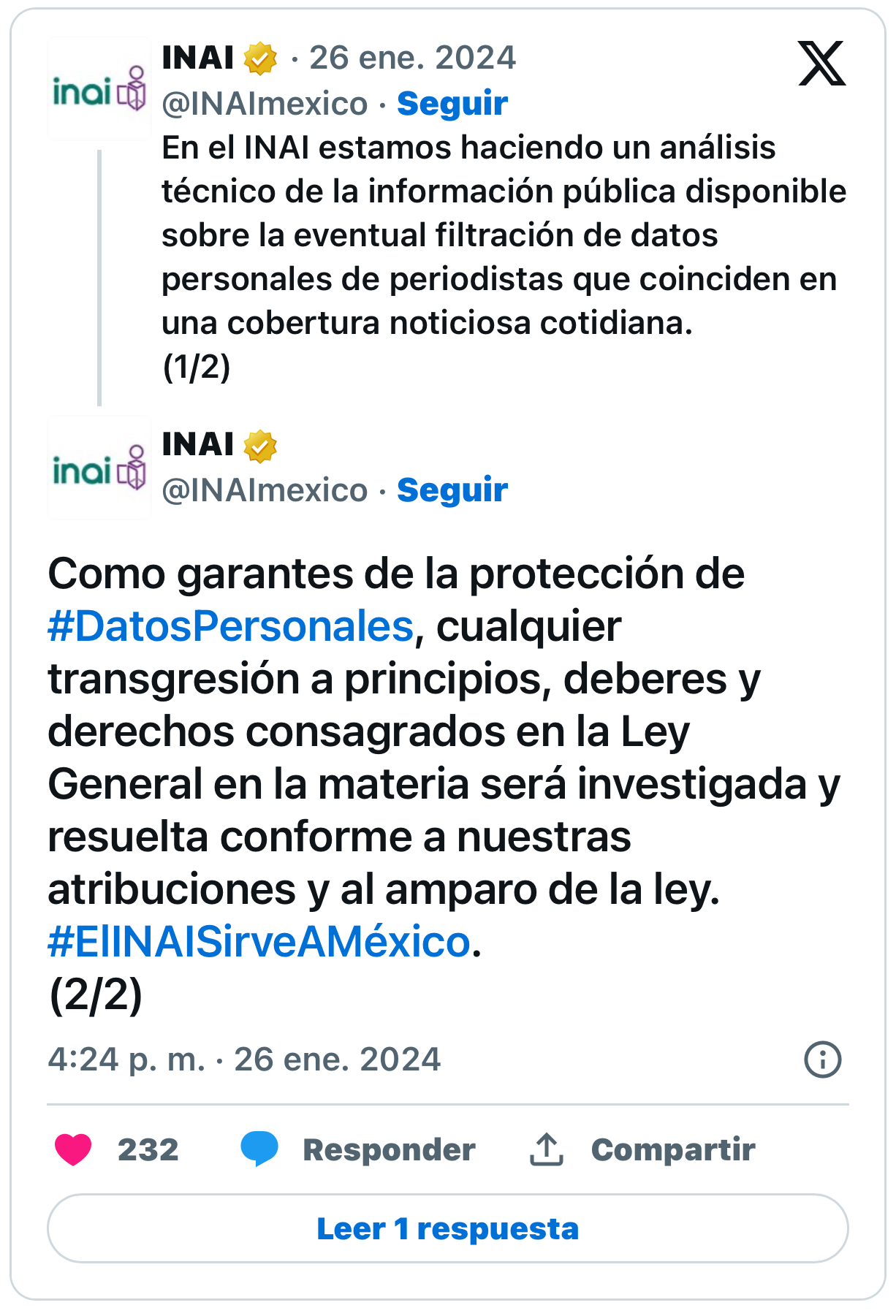 El Instituto Nacional de Transparencia, Acceso a la Información y Protección de Datos Personales (INAI) anunció la realización de un análisis técnico de la información filtrada.