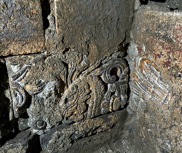 Ejemplo de lo anterior es que, empotrados en la fachada de la esquina interior sureste del cuarto colonial, se detectaron dos sillares prehispánicos trabajados en altorrelieve que representan una serpiente emplumada (Quetzalcóatl) y un tocado de plumas, los cuales debieron pertenecer a un panel del Palacio de Axayácatl. Así también, formando parte un fuste, se registró otra escultura mexica con el glifo que simboliza el tianquiztli o mercado.