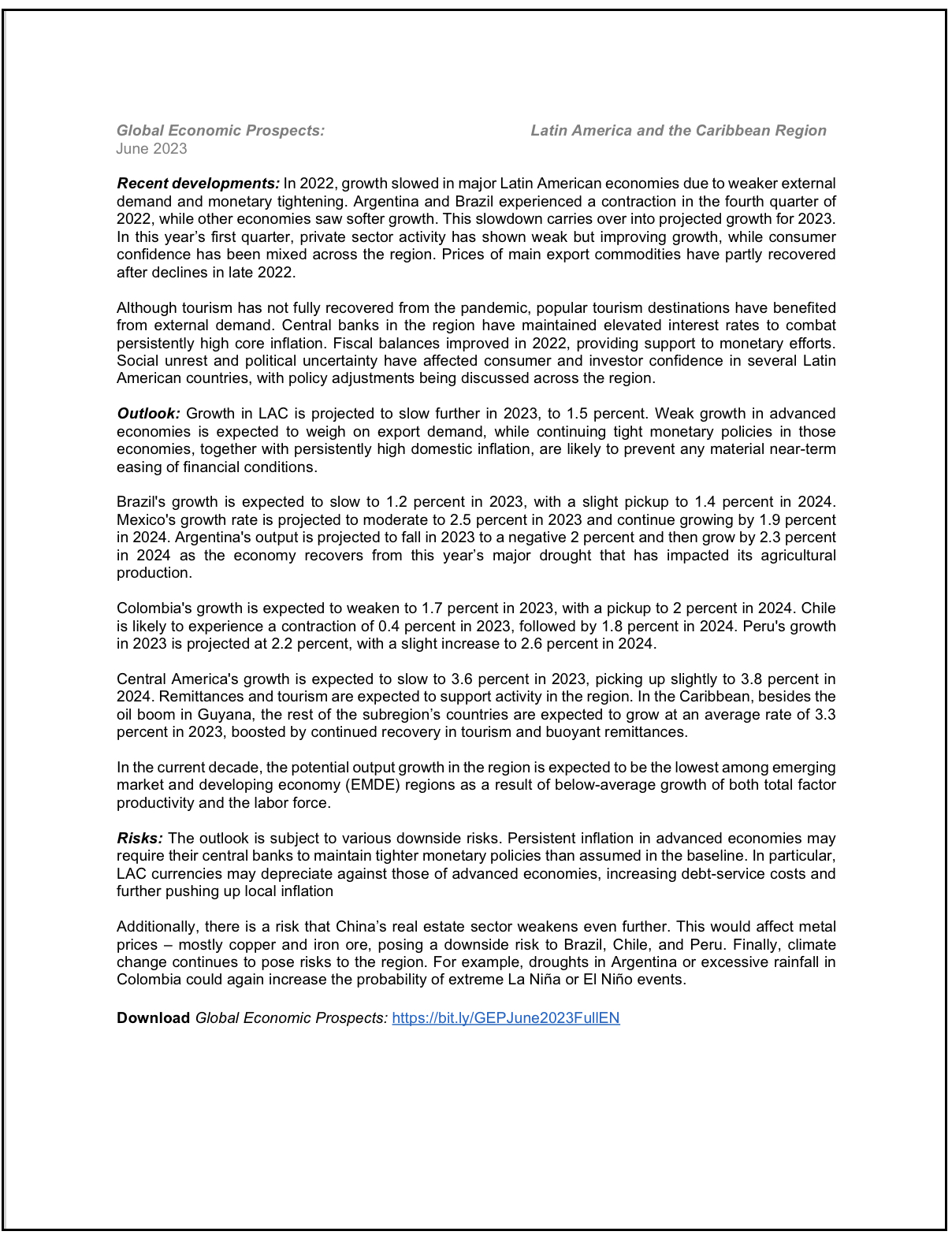 En su nuevo informe de perspectivas globales, el Banco aumentó sin embargo las perspectivas en dos décimas con respecto a sus anteriores proyecciones hechas en enero. Para 2024 redujo sus perspectivas en 4 décimas, y ahora considera que la región crecerá el 2 por ciento.