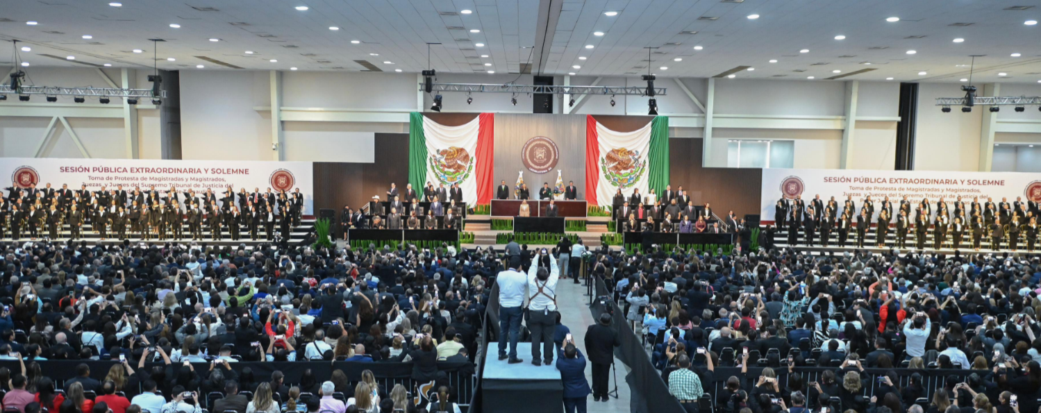 Durante la sesión pública, extraordinaria y solemne del Congreso del Estado, en el Polyforum de esta capital, y luego de la toma de protesta de las y los 147 magistrados y magistradas y juezas y jueces, a cargo del presidente de la Junta de Gobierno, diputado Humberto Prieto Herrera, el gobernador destacó que este acto deja para la posteridad y una imagen inédita, con la concurrencia del pleno de los tres Poderes del Estado, “pero esta vez todos con la legitimidad democrática y la autoridad moral que otorga el respaldo del pueblo”, expresó.