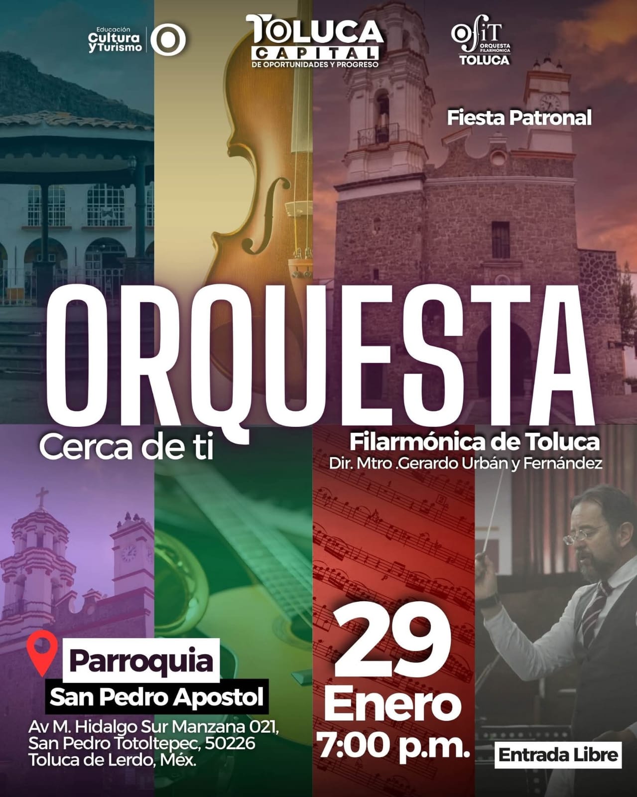 Asimismo, como parte de la política de descentralizar la cultura que impulsa el alcalde Ricardo Moreno, se visitará a varias parroquias y recintos delegacionales o ejidales con los conciertos Orquesta Cerca de Ti, el primero llegará el jueves 29 de enero, a las 19:00 horas, en la Parroquia de San Pedro Apóstol de San Pedro Totoltepec, como parte de la fiesta patronal de la comunidad.