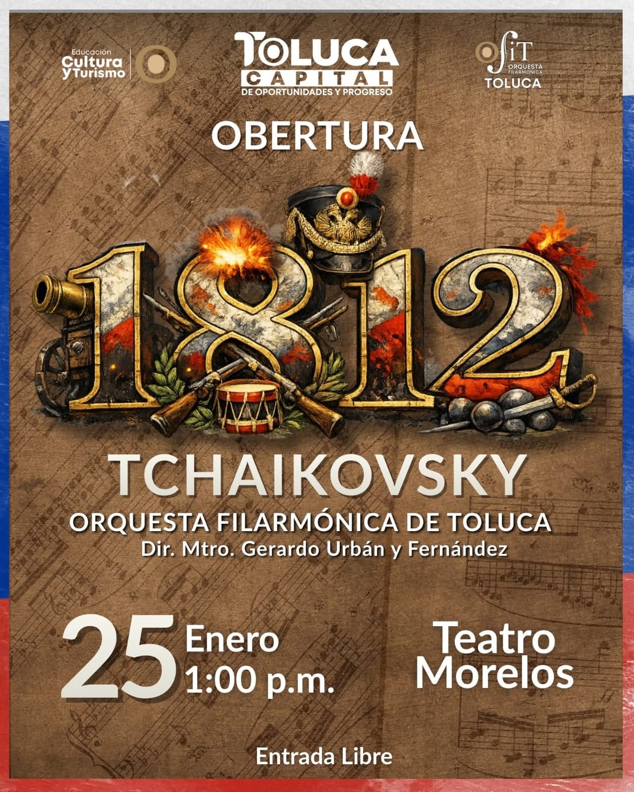 Este domingo 25 de enero, a las 13:00 horas, el Teatro Morelos se llenará de la intensidad y fuerza de la impresionante Obertura 1812 de Tchaikovsky, además de otros grandes éxitos de la música clásica; los 88 músicos bajo la dirección del maestro Gerardo Urbán y Fernández ofrecerán a los asistentes una tarde inolvidable. Se recomienda llegar con anticipación ya que el acceso es libre y gratuito.