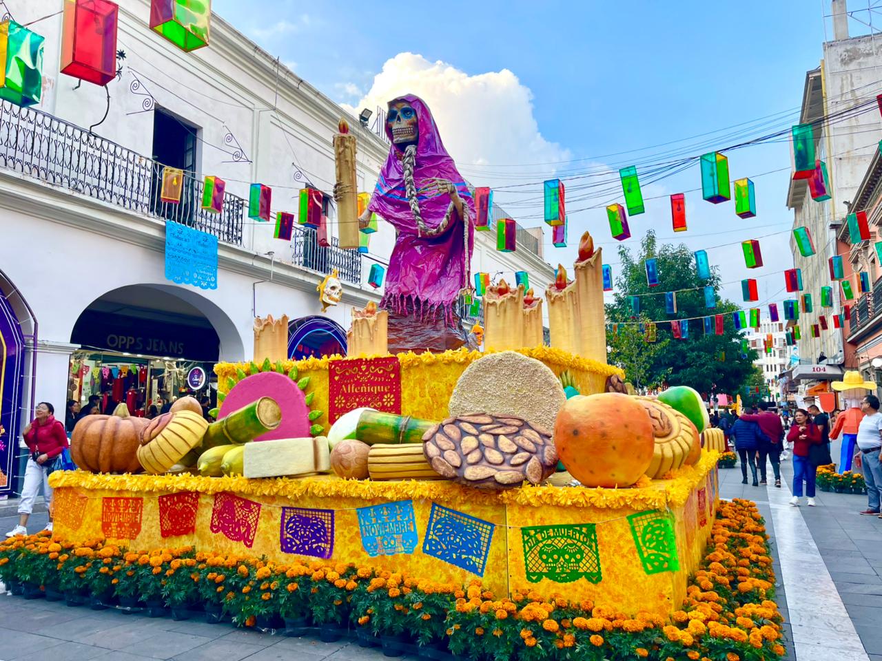 Asimismo, los asistentes pueden tomarse fotografías junto a figuras monumentales que custodian el centro de la ciudad, bellas esculturas de catrinas y xoloitzcuintles, un puente para cruzar al Mictlán y flores de cempasúchil que engalanan estos espacios.