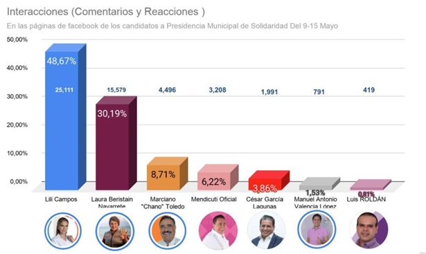 De acuerdo con la evaluación que realiza Facebook con base a los comentarios y reacciones que reciben los candidatos a la Presidencia Municipal de Solidaridad, en Quintana Roo, en la última semana, el 48.67 por ciento demostró su apoyo a la candidata Lili Campos de la coalición formada por los partidos políticos Acción Nacional, Revolucionario Institucional, de la Revolución Democrática y Confianza Por Quintana Roo, denominada “Va por Quintana Roo”.