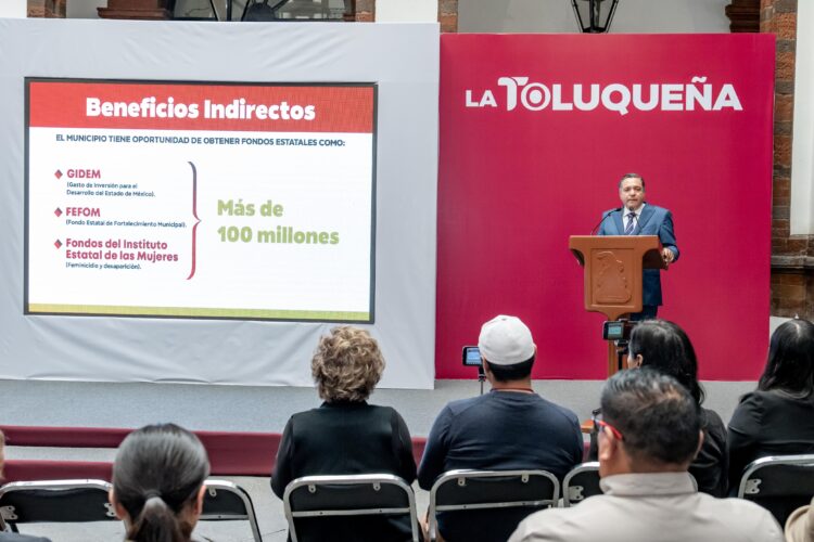 Asimismo, con esta acción Toluca tiene la posibilidad de acceder a beneficios indirectos como obtener fondos estatales en más de 100 millones de pesos como el GIDEM Gasto de Inversión para el Desarrollo del Estado de México; el FEFOM Fondo Estatal de Fortalecimiento Municipal y Fondos del Instituto Municipal de las Mujeres.