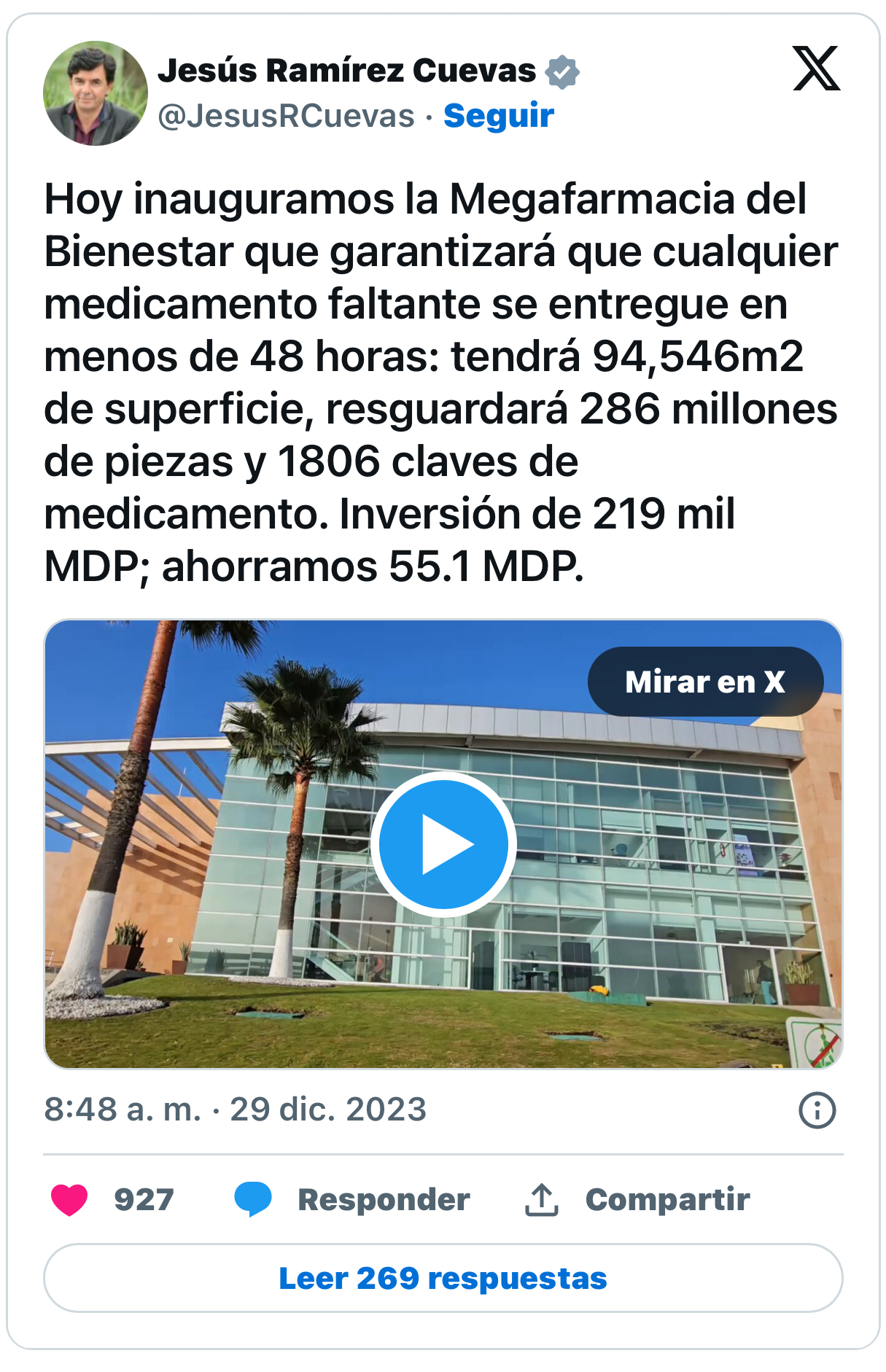 El presidente Andrés Manuel López Obrador celebro que este viernes entrará en operación la megafarmacia, que tendrá “todos los medicamentos que se distribuyen en el Sector Salud” en México.