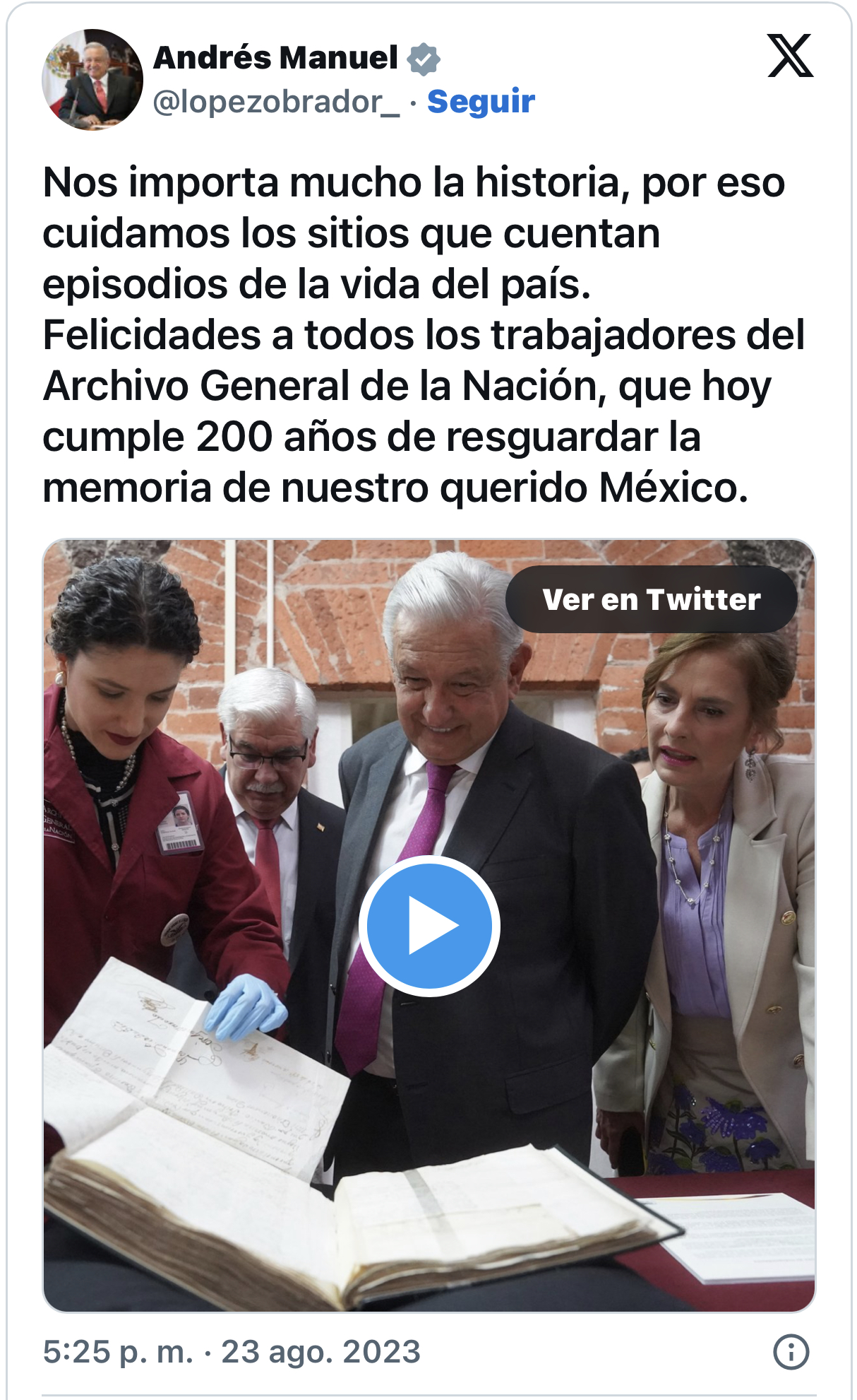 Acompañado de su esposa Beatriz Gutiérrez, el mandatario mexicano recordó que, si bien el Archivo General cumple dos centenarios, su memoria documental tiene una antigüedad mayor a los 450 años.