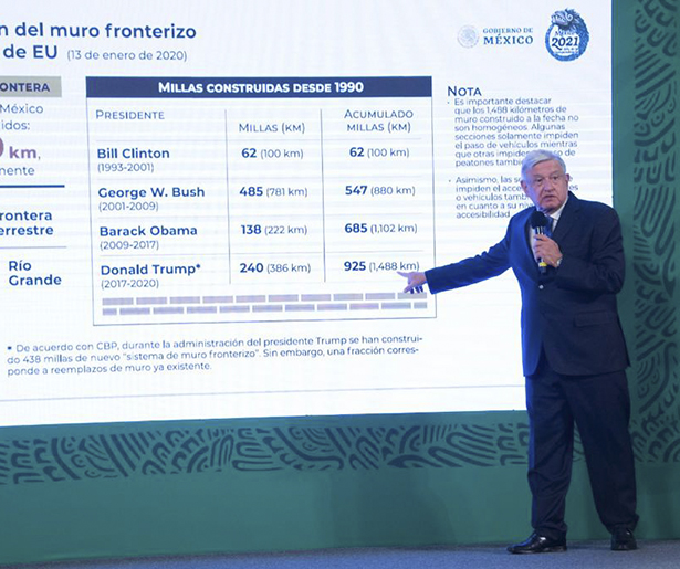 “Ahora el presidente Biden decide que ya no va a construir muro en la frontera, entonces es un hecho histórico porque si tenemos la gráfica, van a ver como se fueron construyendo kilómetros de muro”, comentó AMLO.