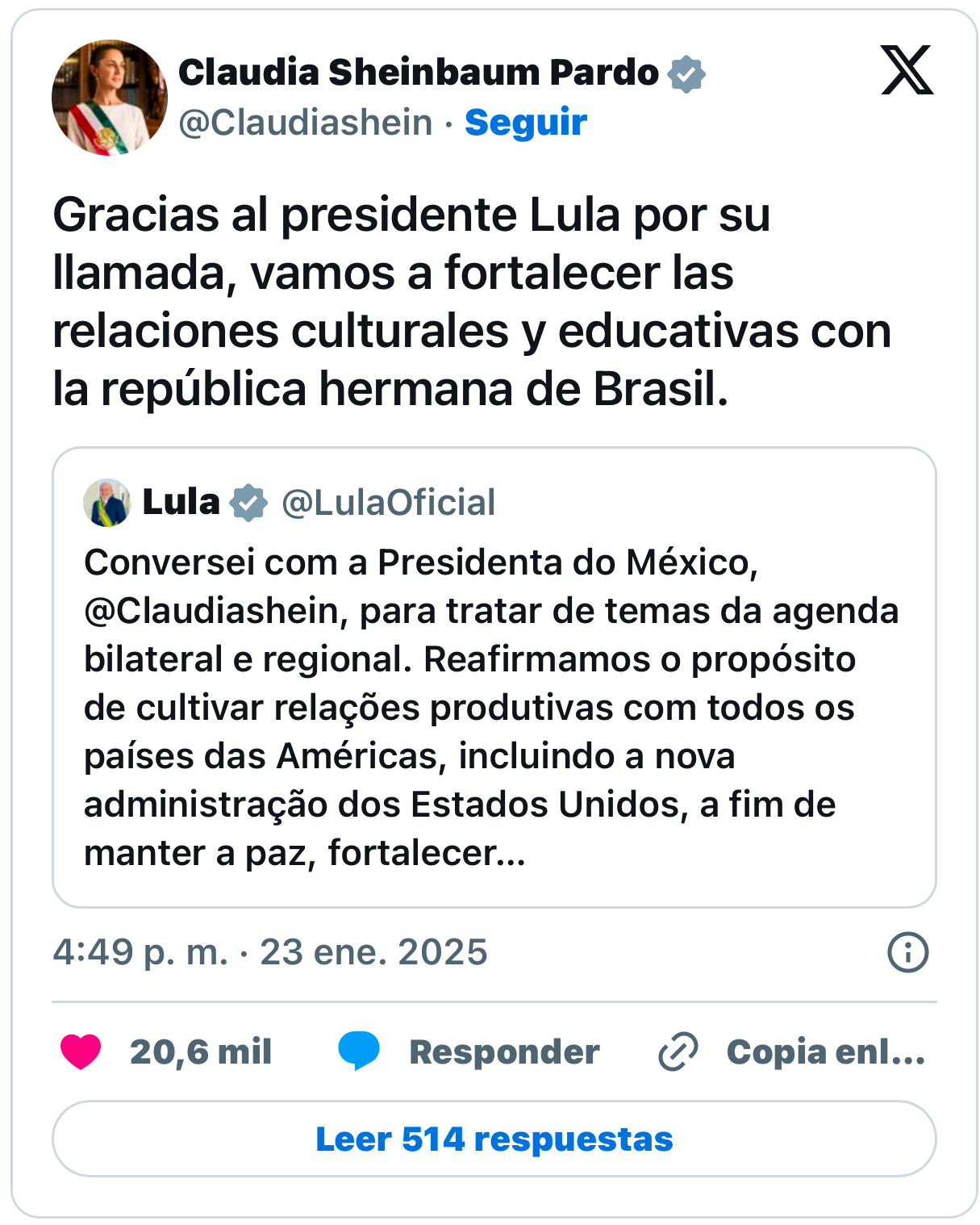 La gobernante mexicana no detalló los temas que conversaría con Lula, pero anunció la conversación tras recibir cuestionamientos de la prensa sobre la comunicación de México con Latinoamérica ante la nueva presidencia de Donald Trump en Estados Unidos.