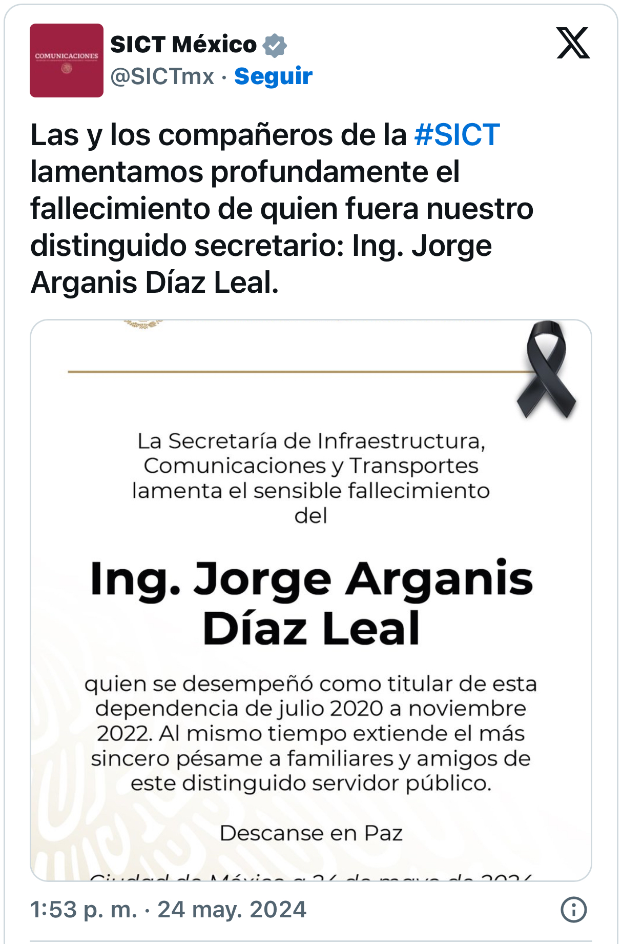 La SICT externó su más sentido pésame a familiares y amigos de quien describió como “distinguido servidor público”.