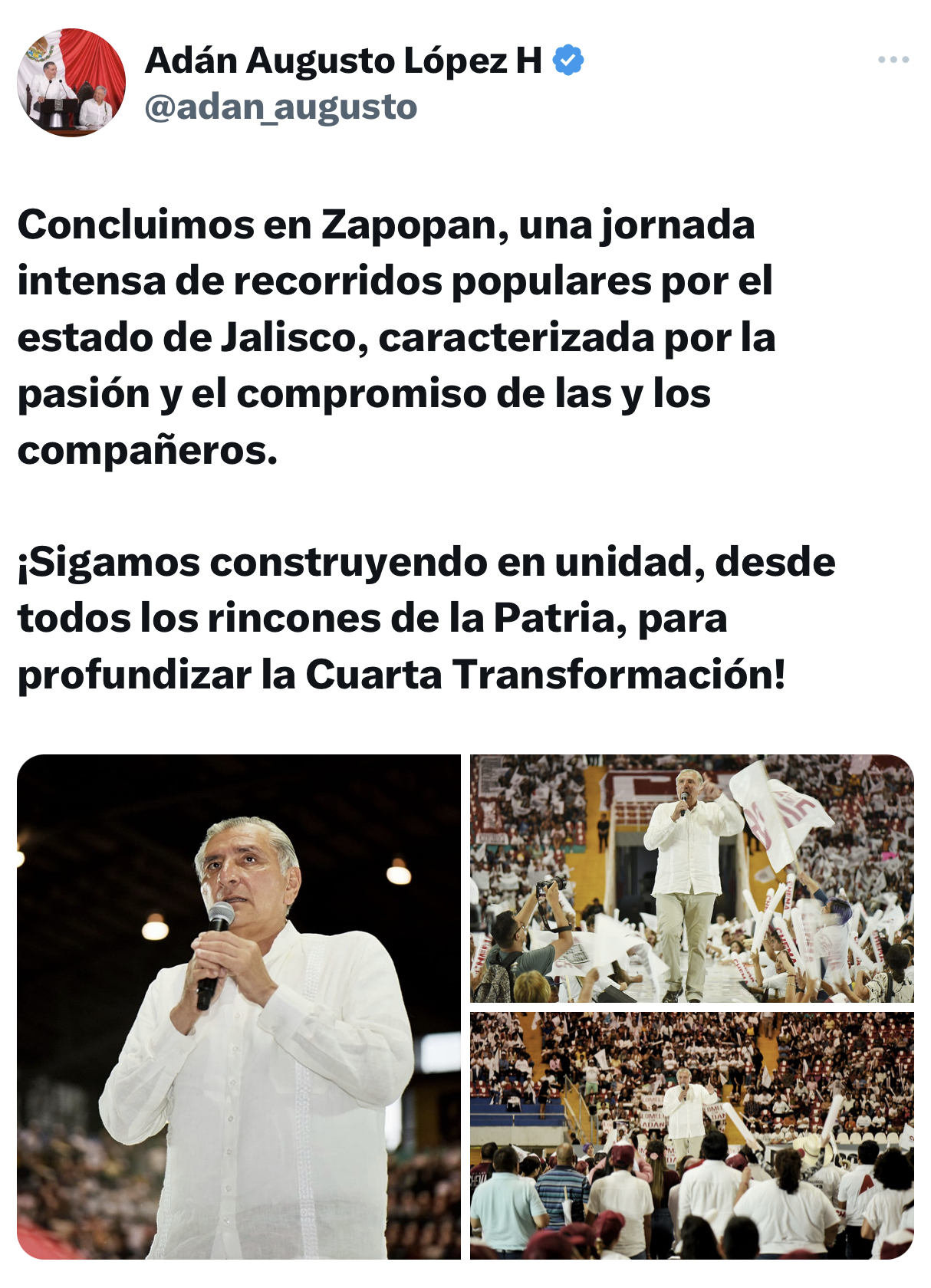 Adán Augusto López Hernández subrayó que esta Asamblea tiene que ser un punto de inflexión en la entidad, por lo que llamó a todos a realizar un ejercicio de honestidad para construir, “desde la bondad y el corazón, como hermanas y hermanos, este movimiento y el futuro de Jalisco, teniendo siempre en cuenta que aquí el que manda es el pueblo”.