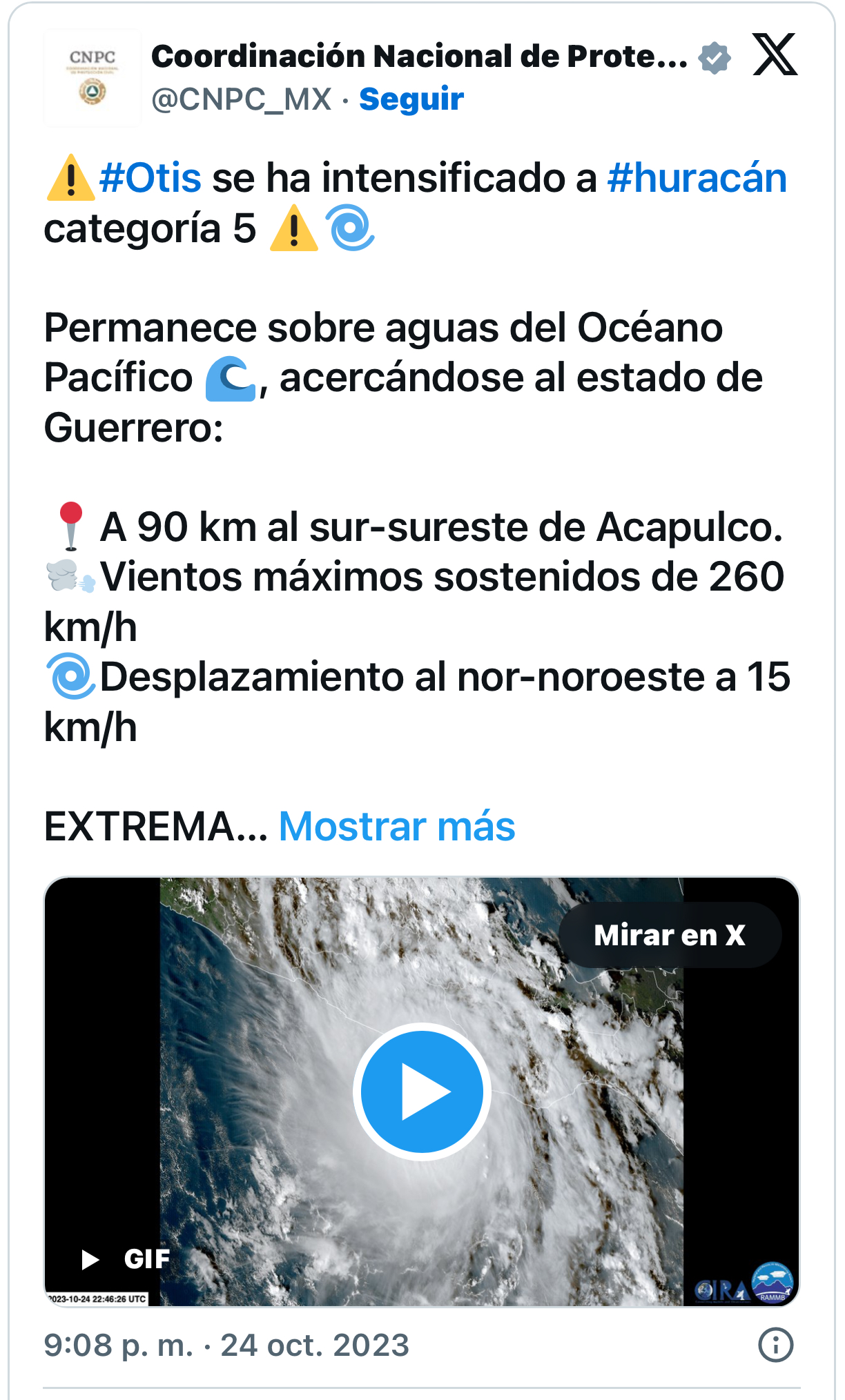 Otis se intensificó la noche de este martes a huracán categoría 5 frente a las costas de Guerrero, con vientos máximos sostenidos de 260 kilómetros por hora.