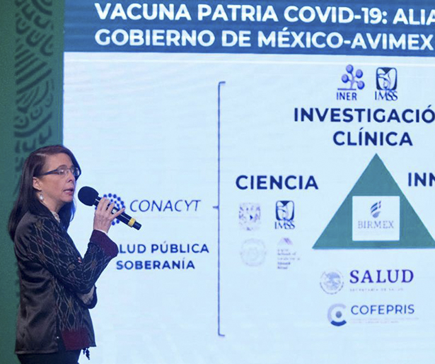 Sobre el desarrollo de la vacuna ‘Patria’ Álvarez señaló que el trabajo realizado hasta el momento está sustentado en las acciones de distinguidos y reconocidos científicos e investigadores entre los que destacó al doctor Constantino III López Macías, investigador en inmunología por la UNAM; al doctor Peter Palese, químico-microbiólogo de la Universidad de Viena; el doctor Adolfo García-Sastre, biólogo por la Universidad de Salamanca; el doctor Florian Krammer, biotecnólogo y virólogo de la Universidad de Recursos Naturales y Ciencias de la Vida en Viena; la doctora Felipa Castro Peralta, bióloga Molecular de la UANL; y la doctoras Marta Torres Rojas, investigadora en inmunología del INER.