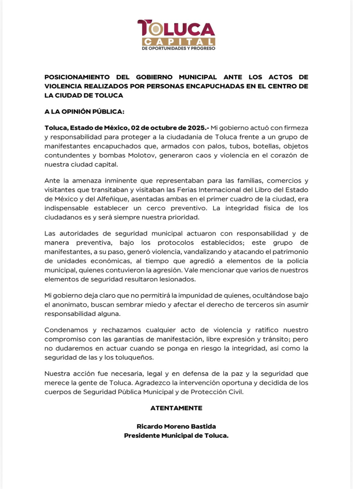 El Gobierno de Toluca reafirmó su compromiso con la paz social y la convivencia democrática, al señalar que no permitirá que provocaciones de pequeños grupos alteren la tranquilidad de la ciudad. El alcalde Ricardo Moreno subrayó que la violencia nunca será el camino y dio la instrucción de actuar con apego a la ley, para evitar que estas acciones pongan en riesgo a la población.