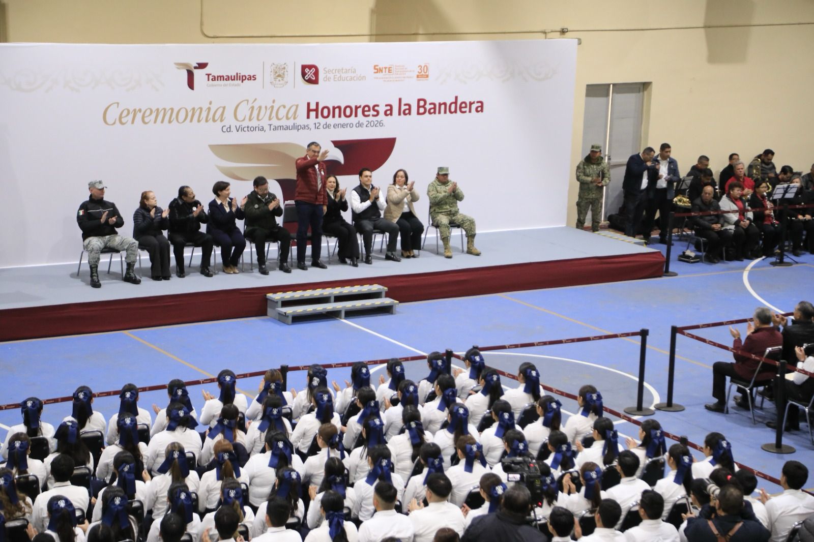 El gobernador de Tamaulipas, Américo Villarreal Anaya resaltó el papel trascendental de la educación y del magisterio en la formación de una sociedad más humana, justa y con visión de futuro, al presidir la Ceremonia de Honores a la Bandera en la Benemérita Escuela Normal Federalizada de Tamaulipas.