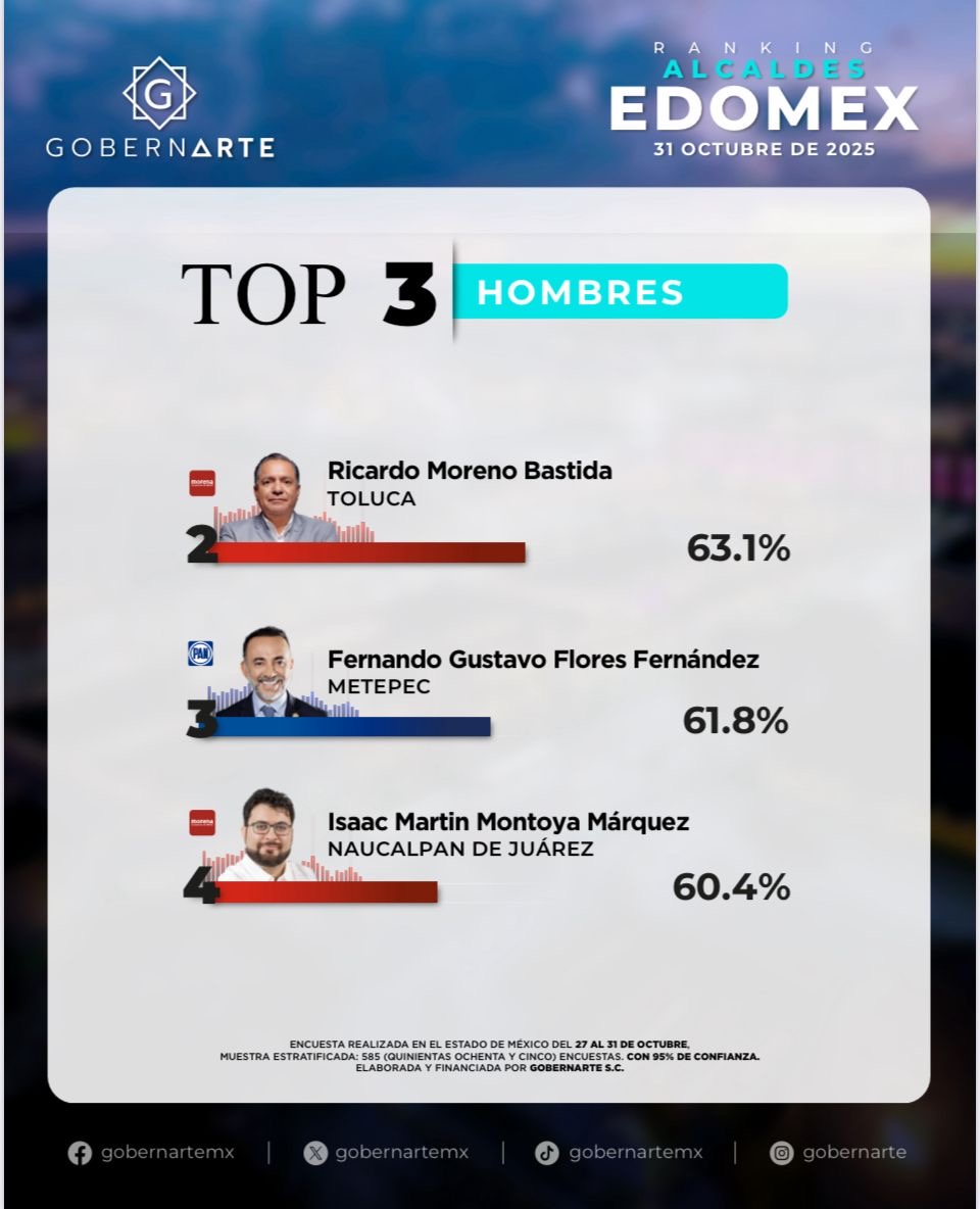 El presidente municipal de Toluca, Ricardo Moreno Bastida, alcanzó el segundo lugar en el Ranking de Alcaldes del Estado de México elaborado por GobernArte S.C., con un 63.1% de aprobación ciudadana, resultado que lo posiciona como uno de los líderes locales mejor valorados por su efectividad y cercanía con la población.