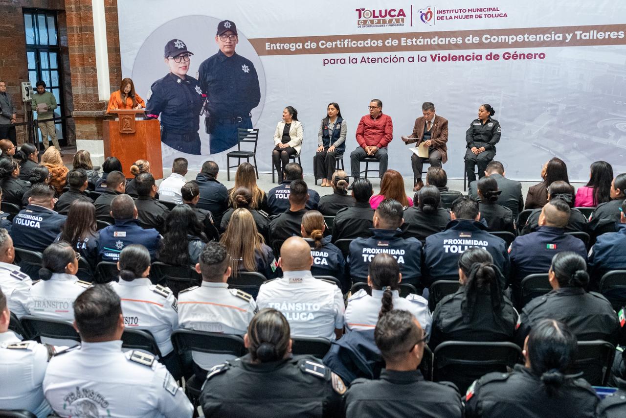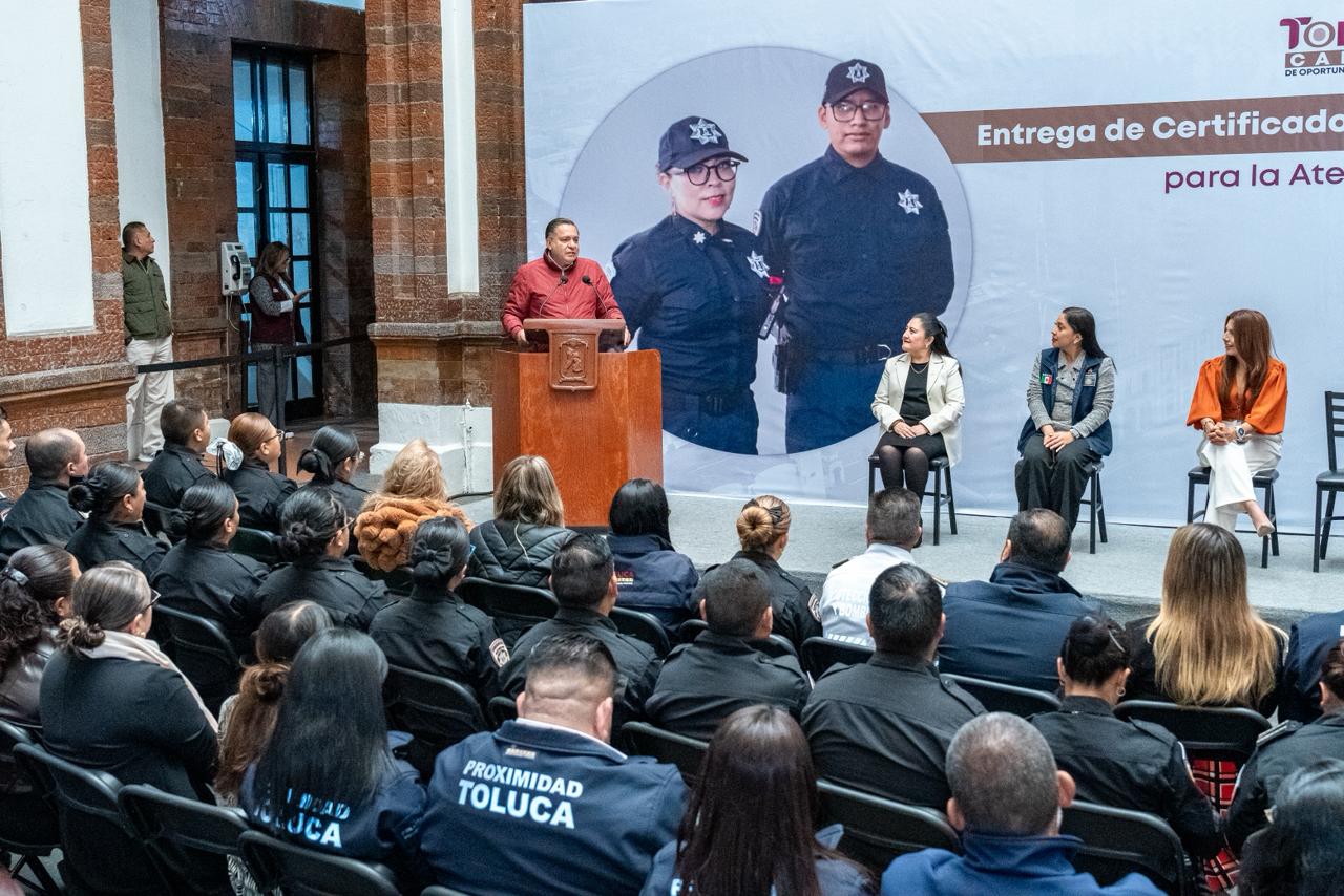 Toluca avanza con acciones para garantizar la protección, el acompañamiento y acceso a la justicia, así como una atención de calidad y calidez para todas las víctimas de violencia, pues cerca de 80 servidores públicos de primer contacto, encabezados por el Presidente Municipal, Ricardo Moreno, recibieron certificaciones en tres competencias y más de 140 recibieron talleres y cursos teórico-prácticos en temas como acoso sexual, violencia de género y estrategias de búsqueda de personas.