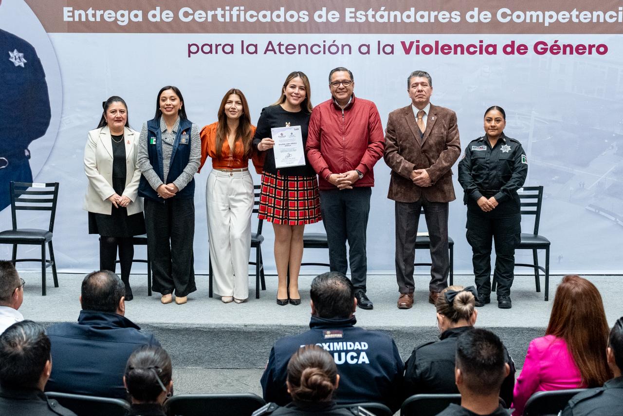 Como parte de los 16 Días de Activismo, el alcalde recibió su reconocimiento y entregó a trabajadores de la Policía de Género, Célula de Búsqueda, Prevención Comunitaria, Defensoría de Derechos Humanos, el Instituto Municipal de la Mujer, Contraloría Municipal y Secretaría del Ayuntamiento, sus documentos que acreditan tres certificaciones en la competencia EC0539 Atención presencial de primer contacto a mujeres víctimas de violencia de género; EC1542 Búsqueda de personas desaparecidas / no localizadas, y EC1172 Acompañamiento inicial para la atención de víctimas.