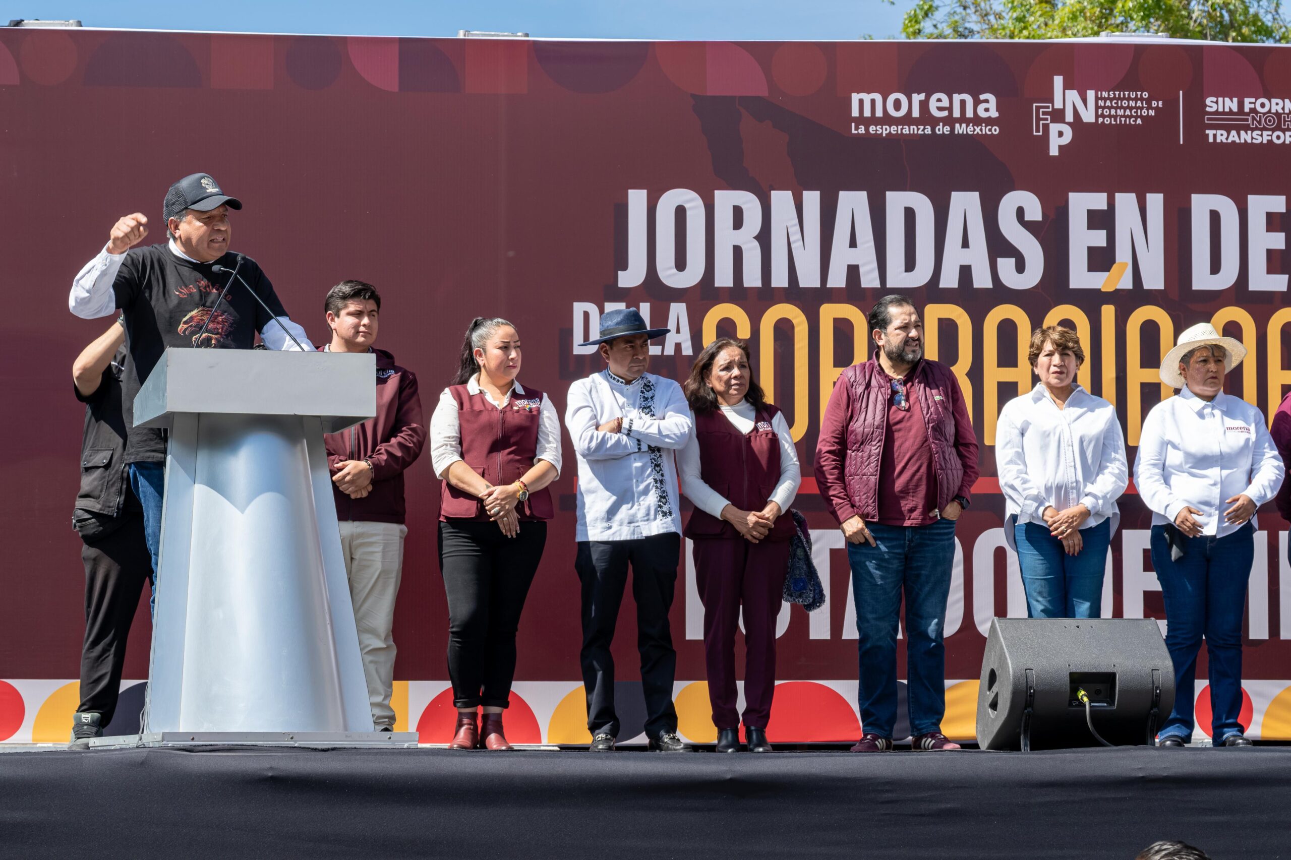 Señaló que la defensa de México no se declara: se organiza, se trabaja y se sostiene en cada municipio, colonia, calle y casa, porque la Cuarta Transformación —dijo— es un movimiento de la gente, nutrido por la historia y por la convicción de un pueblo que no se deja doblar.