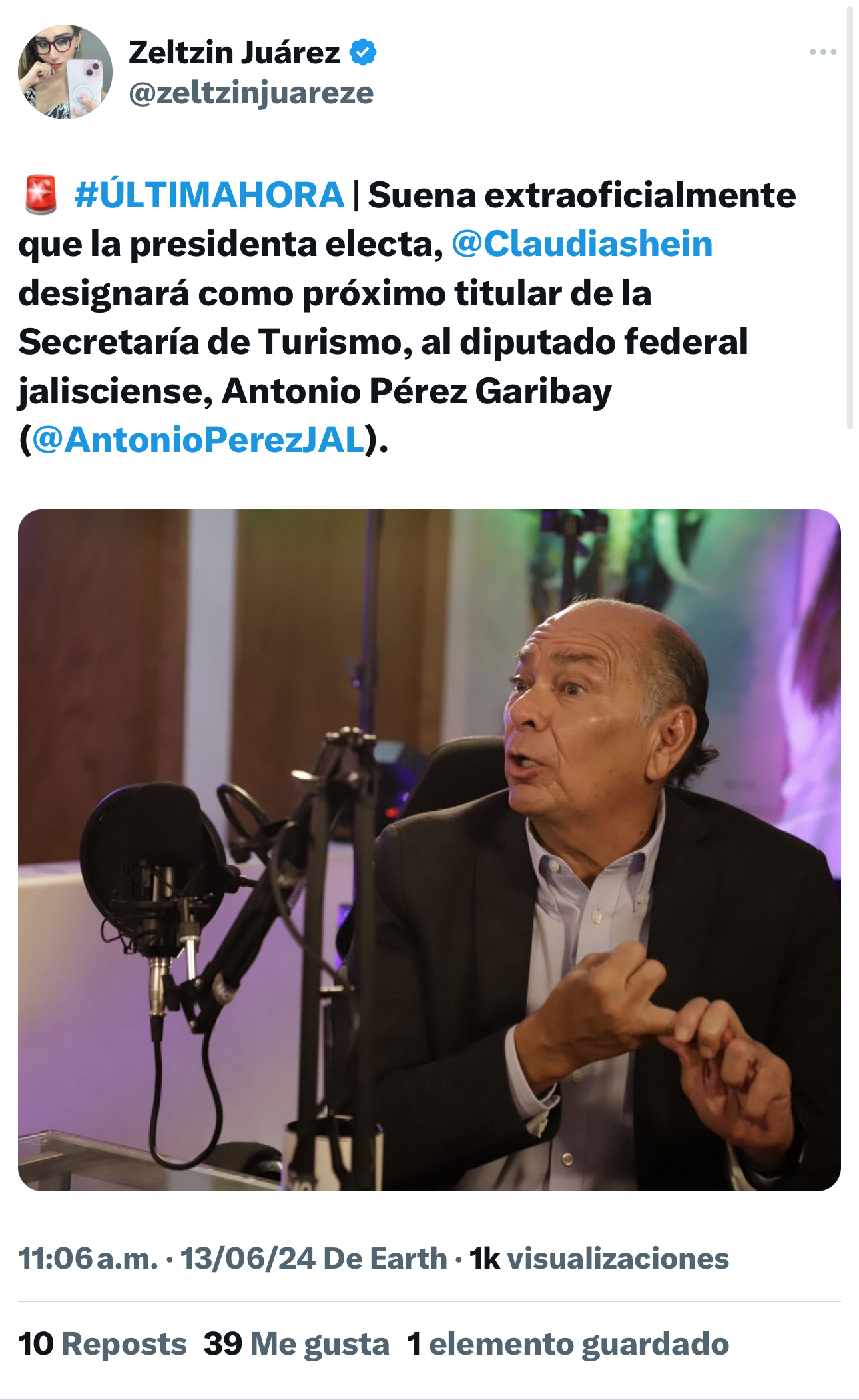 Aunque aún nada está escrito, diversos rumores han comenzado a surgir en las redes sociales, en los que se asegura que el empresario y diputado federal de Jalisco, Antonio Pérez Garibay sería designado como nuevo titular de Sectur.