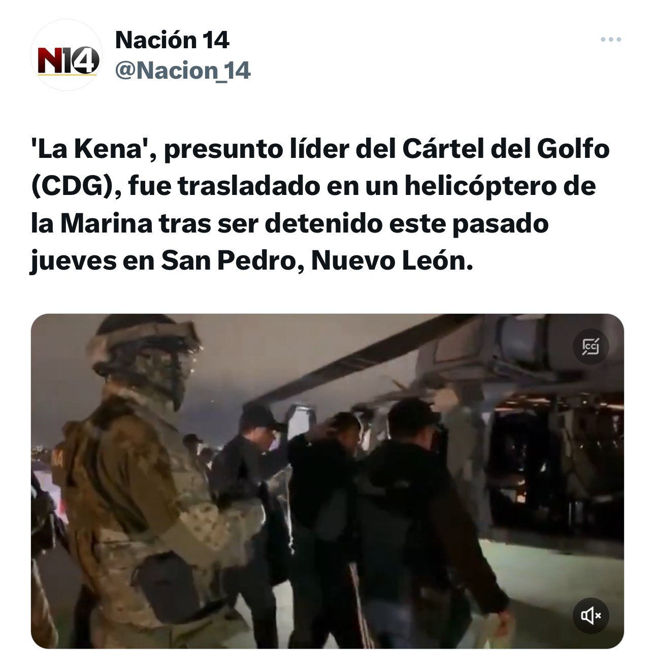José Alberto ‘N’ alias ‘La Kena’, cabecilla de ‘Los Ciclones’ del Cártel del Golfo fue trasladado fuera de la Agencia Estatal de Investigación (AEI) de Nuevo León a bordo de un helicóptero de la Marina.