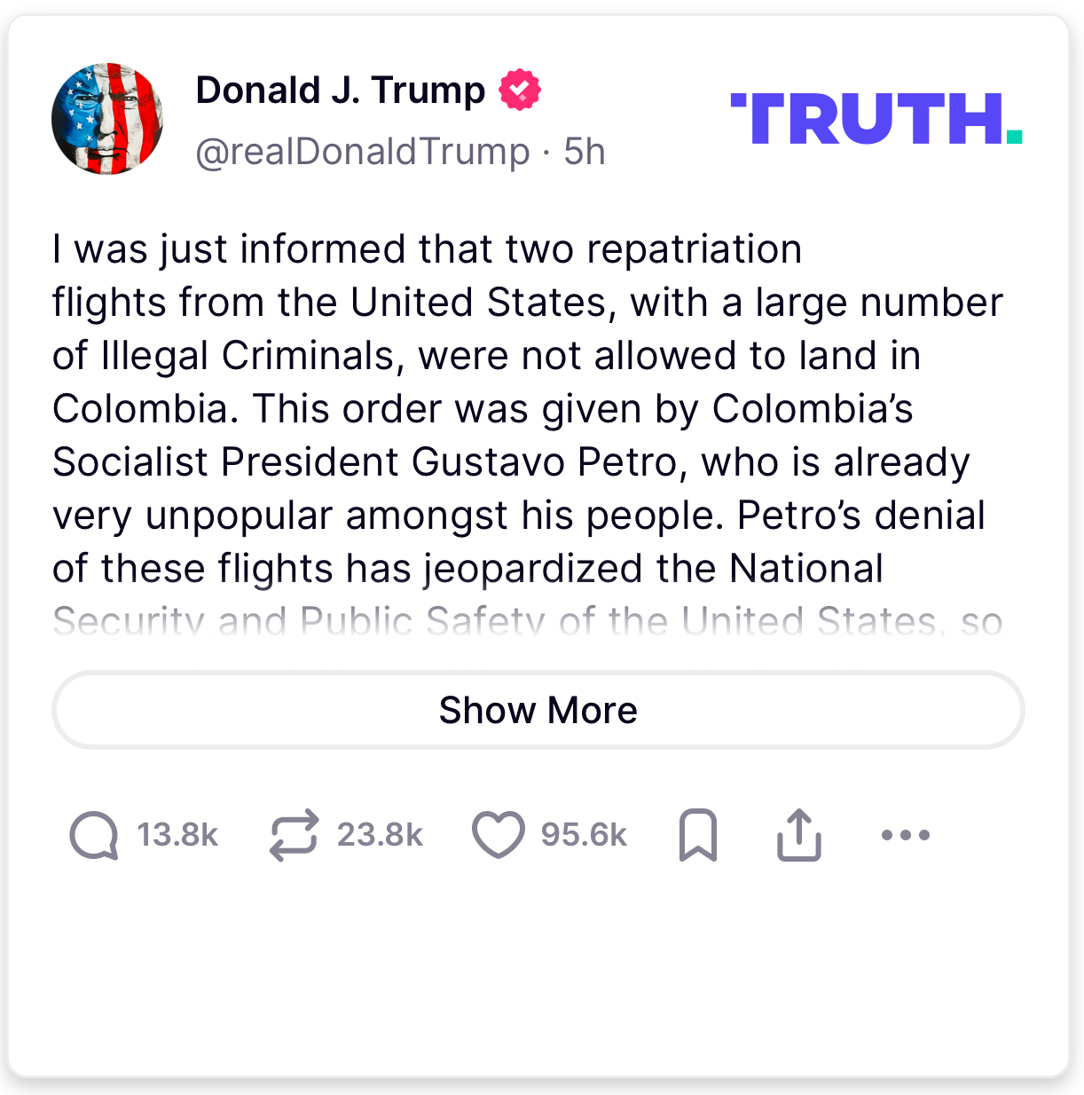 Y es que, según las palabras del propio mandatario estadounidense en su última publicación, entre los individuos que se pretendía deportar a Colombia había “un gran número de delincuentes ilegales“.