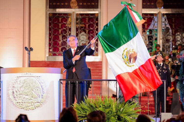 Acompañado de la doctora María Santiago de Villarreal, presidenta del DIF Tamaulipas, así como de los representantes de los Poderes Legislativo y Judicial y mandos militares, luego de recibir la enseña nacional de manos de la escolta integrada por elementos del Ejército Mexicano, el mandatario tamaulipeco se dirigió a la escalinata principal del Palacio de Gobierno para vitorear a los héroes de la patria.